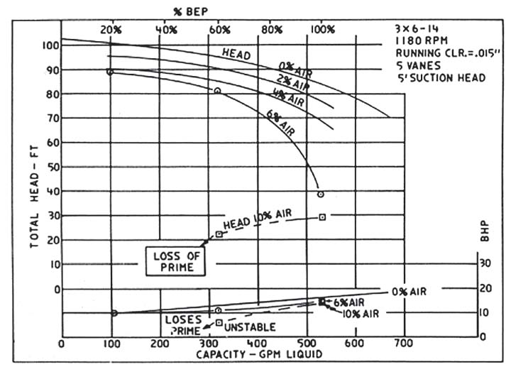 在氣體含量為 2% 左右的所有情況下,都需要對泵性能進行校正?梢蕴幚 10% 以上的氣體濃度,但需要設計具有特定氣體處理特性的泵,例如渦流葉輪泵、側通道泵和再生渦輪泵。