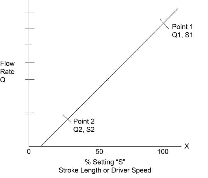 3、計量泵流量與沖程特性曲線呈線性關(guān)系(圖3)。然而,它不一定成比例,因為 50% 的沖程設(shè)置可能不等于 50% 的流量。這是因為校準(zhǔn)線可能不會同時通過兩個軸上的 0。通過在兩個沖程設(shè)置下測量流量,繪制兩個點(diǎn)并通過它們畫一條直線,可以準(zhǔn)確預(yù)測其他流量與沖程的關(guān)系。