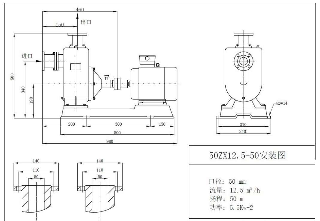 50ZX12.5-50自吸泵型號前面的50代表進出口口徑為50mm、ZX表示為自吸式離心泵、12.5代表額定流量12.5立方米每小時、50表示泵的額定揚程50米、自吸高度為5米,配用5.5KW功率電機。如果用戶要求吸程較高,還可以加裝真空輔裝置,做成吸程可達9米的高吸程自吸泵。應當注意的是,因為自吸泵參數是使用清水測試而得出的,但在使用中會因為輸送介質的粘度及管道損耗等原因,導致實際使用中流量、壓力參數減小。所以在選型的時候應當留有一些余量,尤其在工況要求揚程必須達到50米時,建議選大一個自吸泵型號,選擇50ZX15-60自吸離心泵使用。